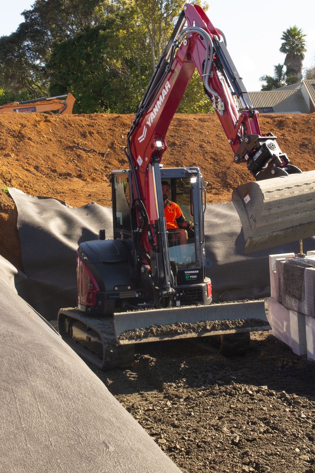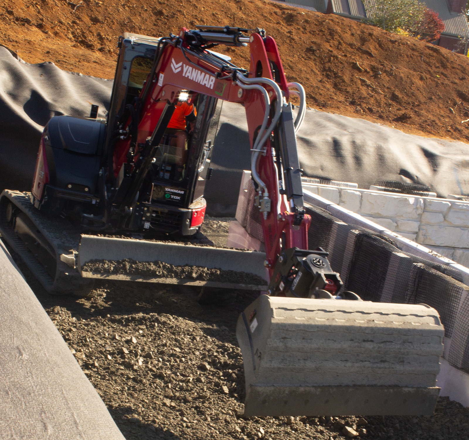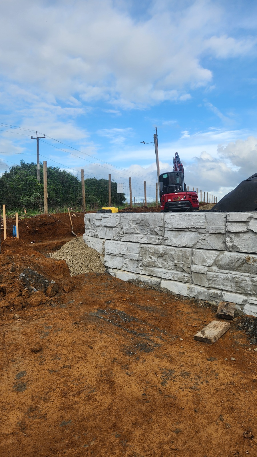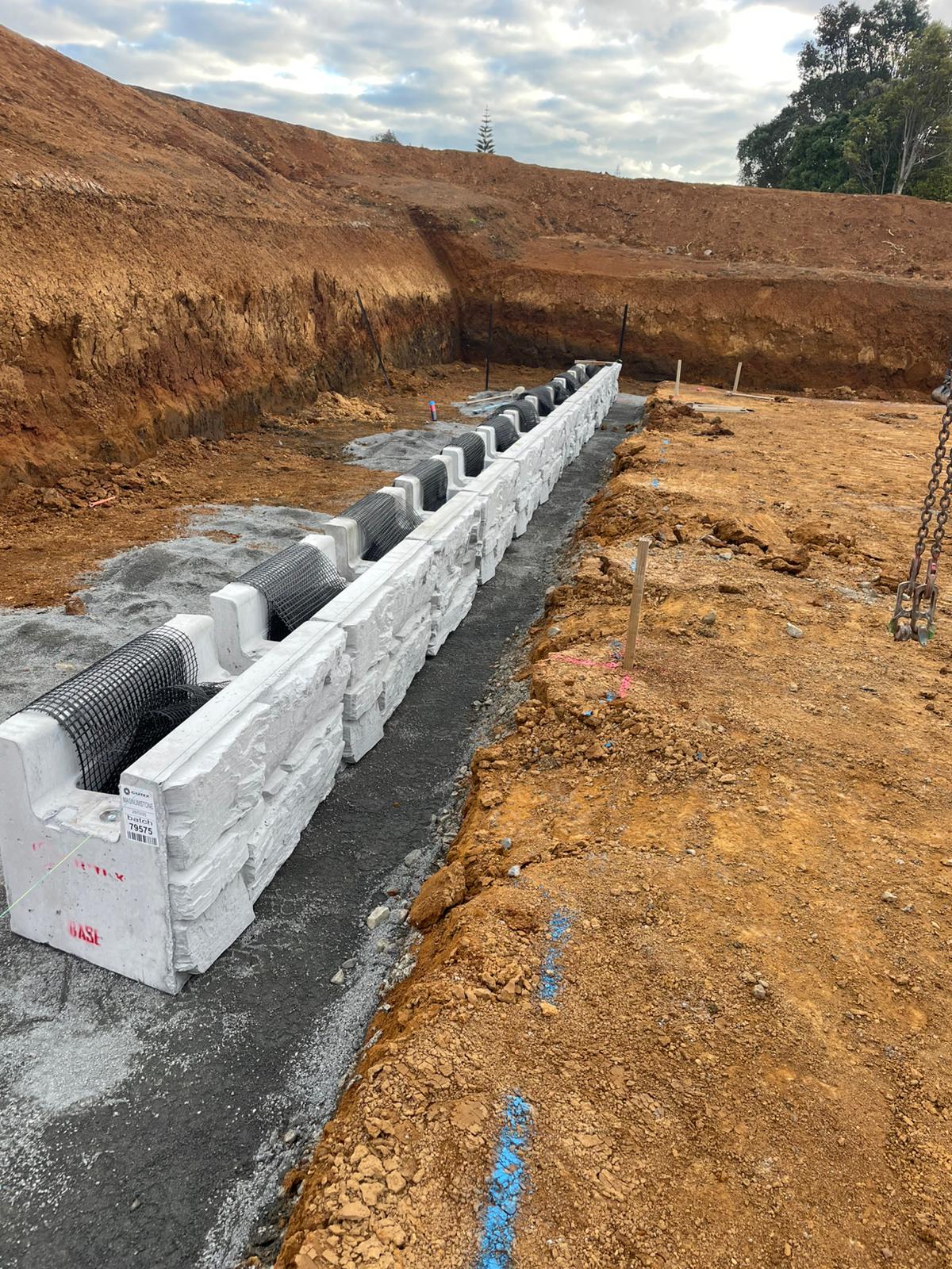 Placement of over 1,000 imported retaining blocks, meticulously staged to align with ongoing construction activities elsewhere on site - Phased construction planning to accommodate adjacent development works, ensuring safety, minimal disruption, and efficient workflow